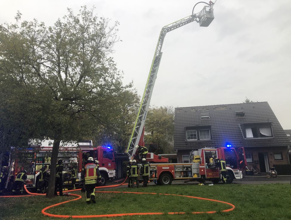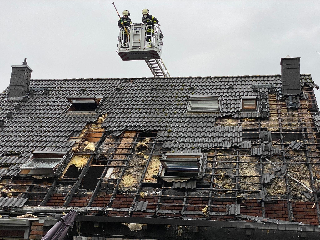 Es brannte im Wintergarten einer Doppelhaushälfte. Das Feuer breitete sich auf das Wohnzimmer sowie den Dachstuhl aus. Mehrere Trupps unter Atemschutz und C-Rohren gingen zur Brandbekämpfung vor. Das Feuer griff über den Dachstuhl ebenfalls auch auf das Nachbargebäude über. Über die Drehleiter wurde die Dachhaut teilweise geöffnet und Glutnester abgelöscht. Über die Gartenseite konnte ebenfalls mittels Steckleiter die Dachhaut geöffnet und somit der Brand gelöscht werden. Ein Bewohner kam mit leichten Brandverletzungen in ein Krankenhaus. Beide Häuser sind zur Zeit nicht mehr bewohnbar. Die Einsatzstelle wurde an die Kriminalpolizei übergeben.