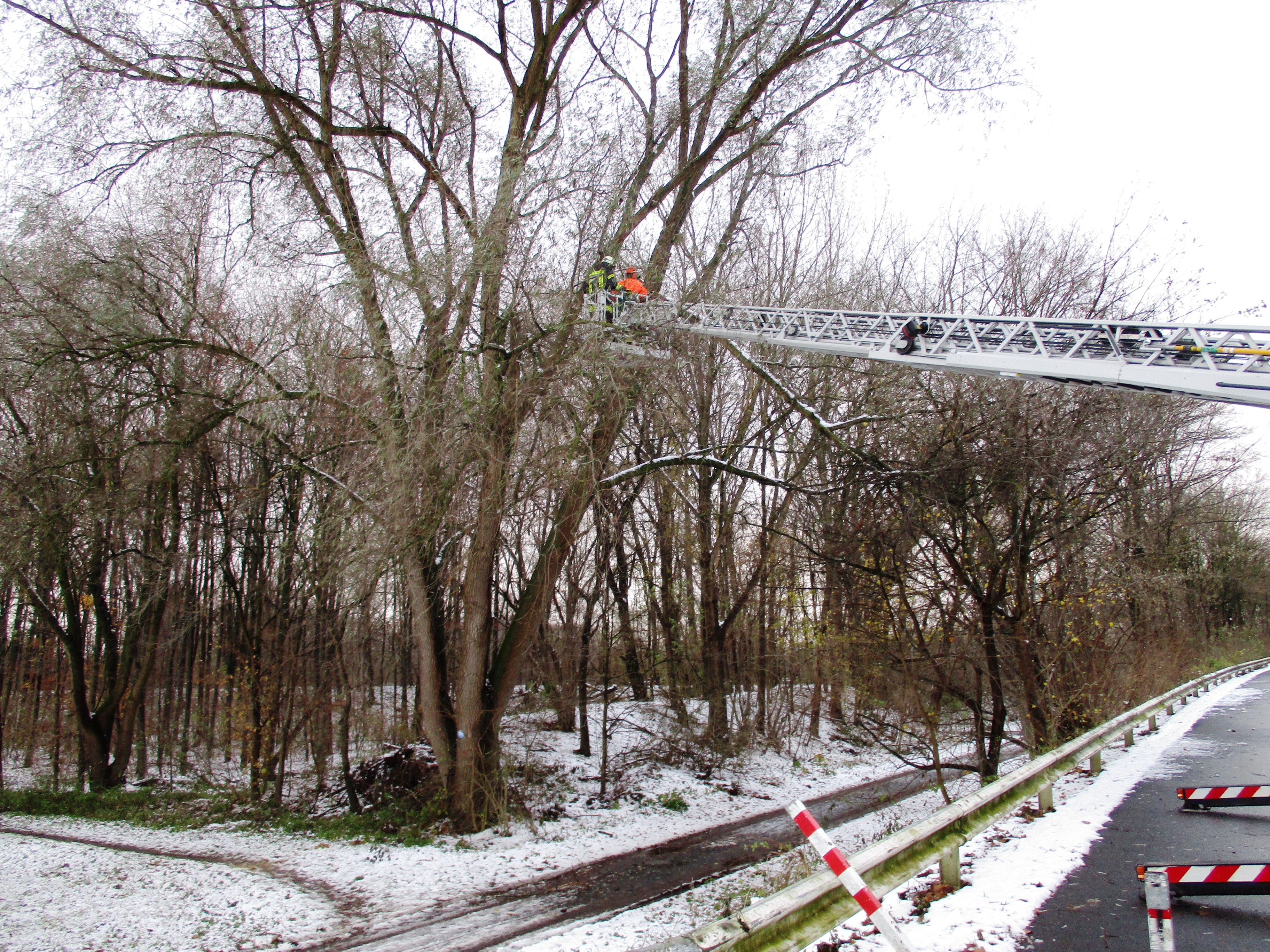 Ein Ast (20 cm dick, 10 Meter lang) war mittig gebrochen und drohte auf die Fahrbahn zu stürzen. Er wurde abgesägt und an den Seitenrand abgelegt.