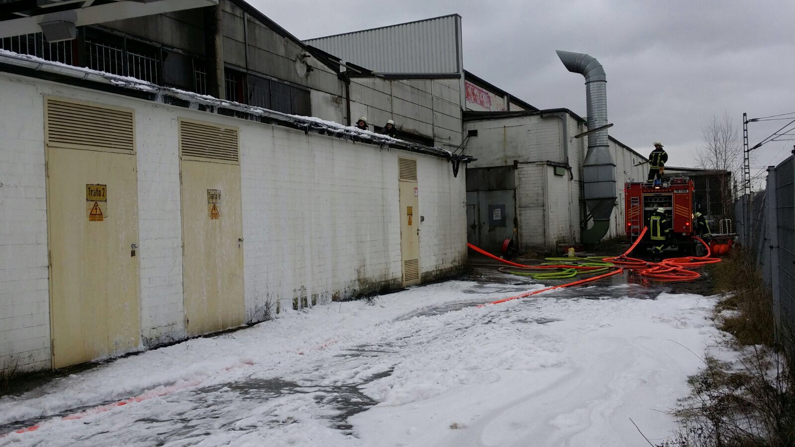 Wie sich herausstellte brannte das Flachdach eines Vorbaus einer größeren Lagerhalle. Der Brand wurde von vier Angriffstrupps unter Atemschutz unter anderem