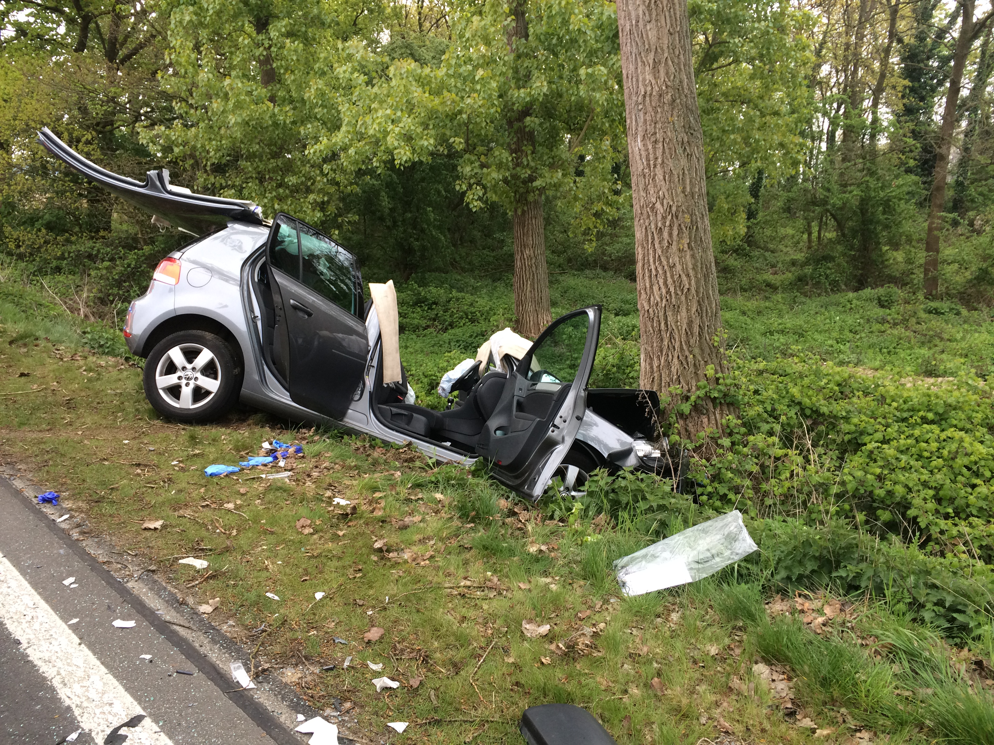 Der PKW schleuderte nach der Kollision mit dem LKW frontal vor einen Baum.