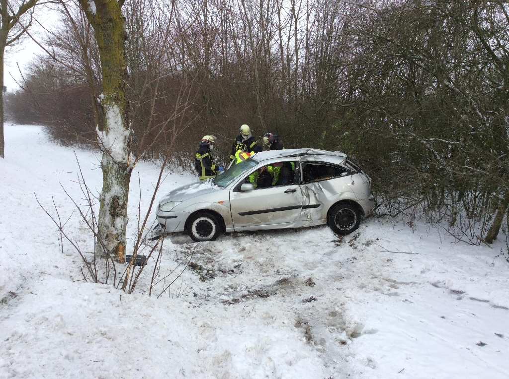 Ein Pkw prallte seitlich gegen einen Baum und blieb im Graben liegen. Der Patient wurde vom Rettungsdienst versorgt und die Fahrzeugbatterie durch die Feuerwehr abgeklemmt. Die Einsatzstelle wurde an die Polizei übergeben.
